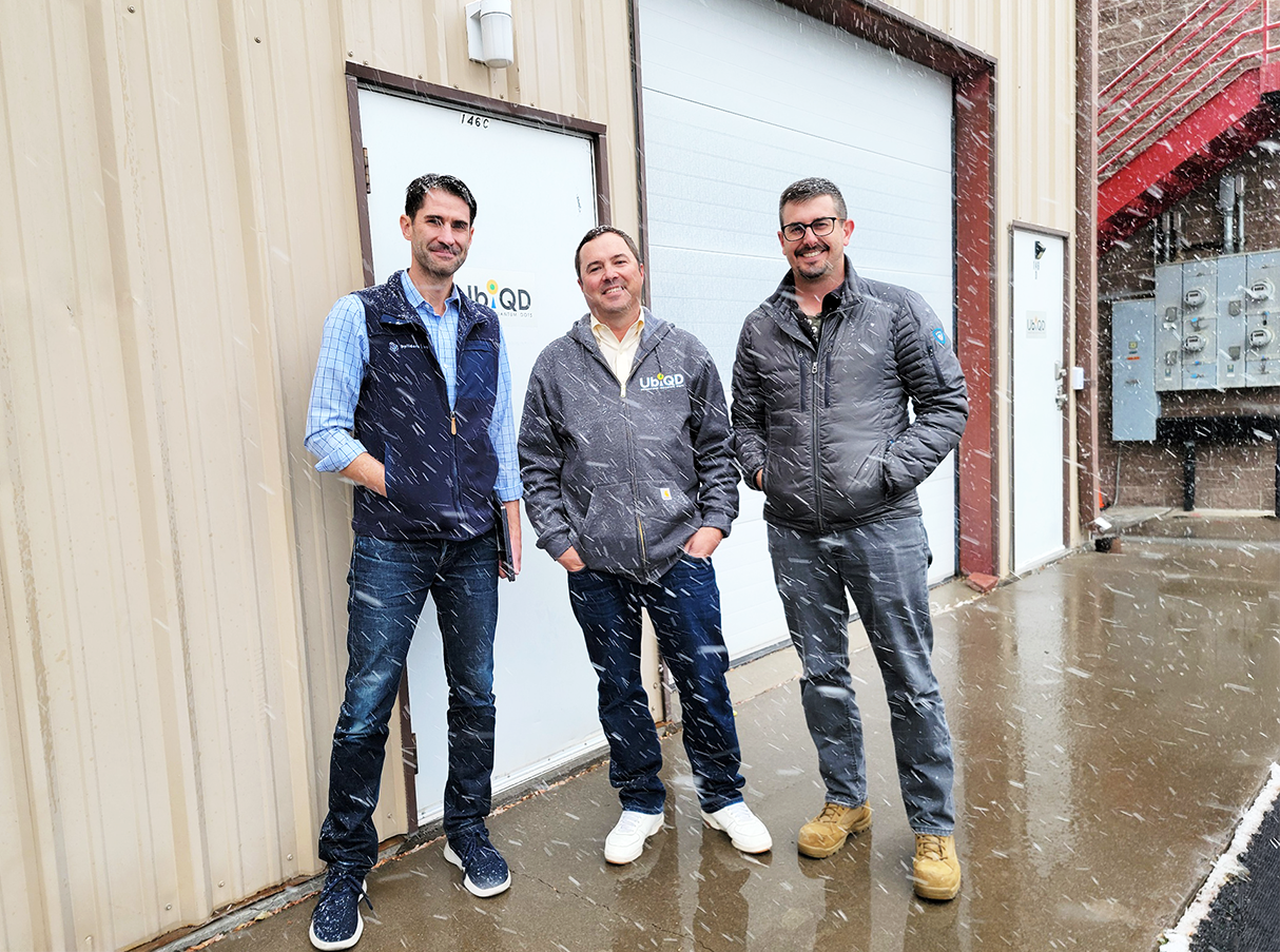 Enjoying the afternoon snowfall today in front of UbiQD at 134 Eastgate Dr., from left, Chief Financial Officer Tony Beams, CEO Hunter McDaniel and Chief Product Officer Matt Bergren. Photo by Carol A. Clark/ladailypost.com