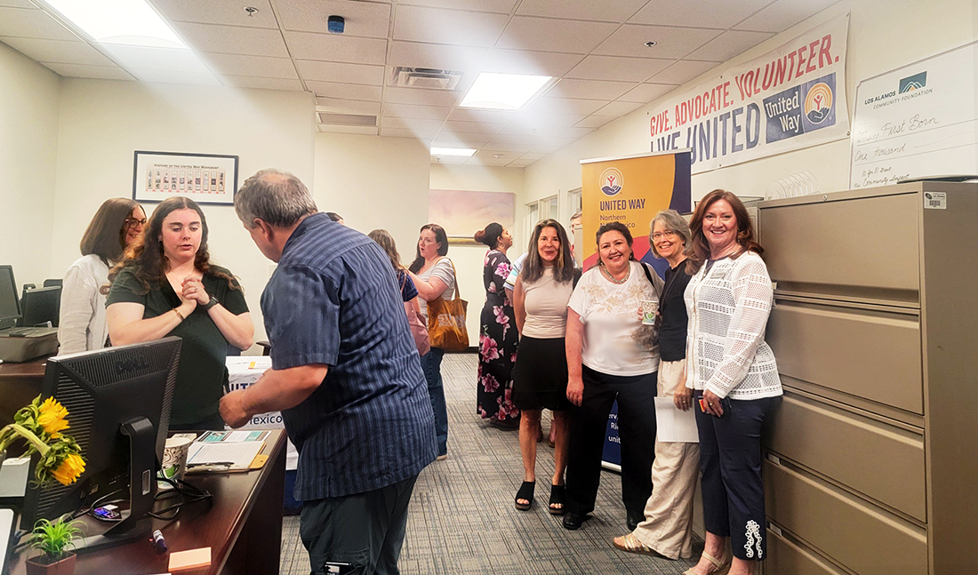 Board members and staff of United Way of Northern New Mexico (UWNNM) and Los Alamos Community Foundation (LACF), and others gather Tuesday morning, July 8, for ‘Coffee & Connections’. The event, organized by the Los Alamos Chamber of Commerce, was held in the UWNNM and LACF offices, which are donated by Enterprise Bank & Trust and located in the area adjacent to the lobby of the bank. The four attendees at right include CASA First Executive Director Annie Rasquin, LISW, Enterprise Bank Los Alamos Region President Liddie Martinez, LACF Executive Director Liz Martineau and UWNNM Executive Director Cindy Padilla. County Councilor David Reagor, at left, is pictured chatting with folks. The next ‘Coffee & Connections’ event is scheduled for 10 a.m. Tuesday, July 15, at Los Alamos Co-Op Market, followed by Pig & Fig July 22, Wolf & Mermaid 29 and Los Alamos Airport Aug. 5. For details on how to host a ‘Coffee & Connections’ event, email Chamber Director Sandy Jones at Sandy@losalamos.org. Photo by Carol A. Clark/ladailypost.com