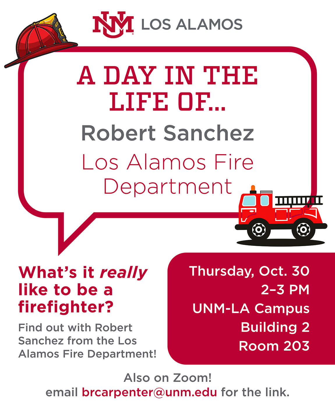 UNM-Los Alamos (UNM-LA) announces its next “A Day in the Life Of …” career talk speaker is Robert Sanchez with the Los Alamos Fire Department. The talk is 2-3 p.m. Thursday, Oct. 30 in room 203 on the UNM-LA campus as well as via Zoom.