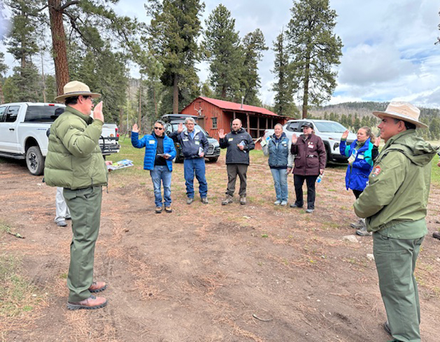VCNP Chief of Interpretation, Education and Volunteers Dave Krueger, left, inducts participants on the press tour into the park’s Junior Ranger Program while Park Superintendent Jorge Silva-Bañuelos, right, looks on. Photo by Kirsten Laskey/ladailypost.com