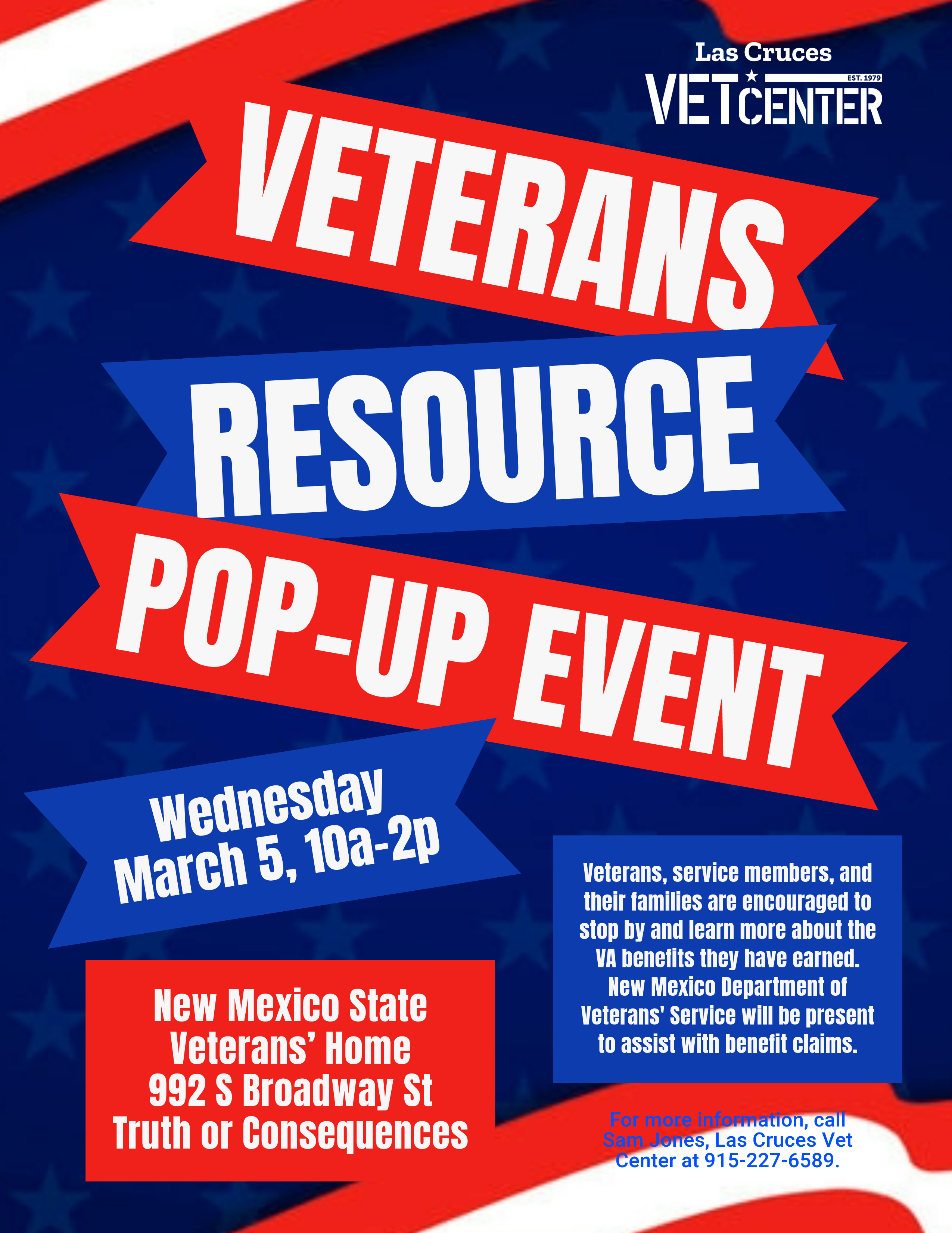 Veterans Resource Pop-Up Event organized by the Las Cruces Mobile Vet Center from 10 a.m. to 2 p.m., Wednesday, March 5, at New Mexico State Veterans’ Home, 992 S. Broadway St., Truth or Consequences.