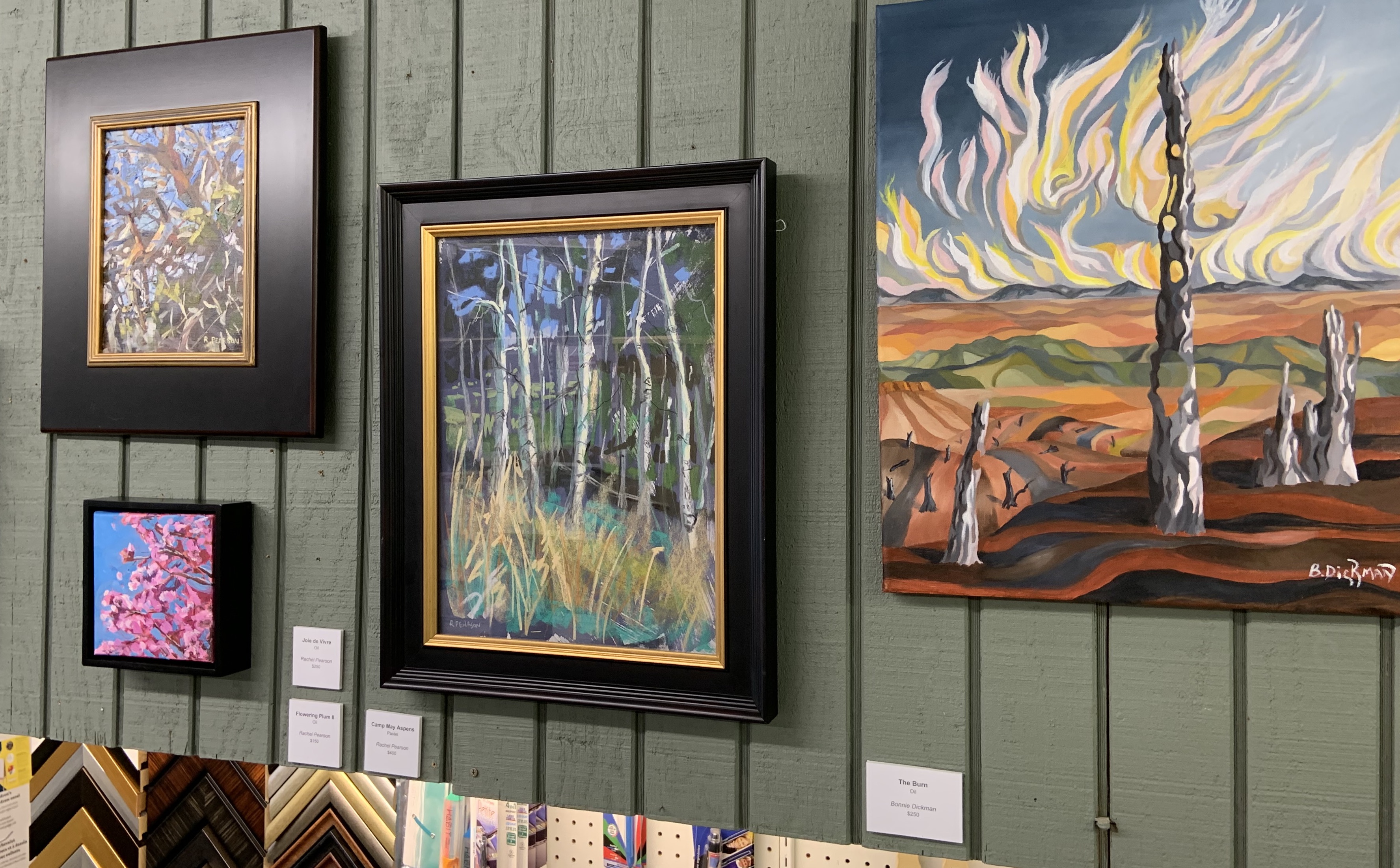 The artists in this exhibit branched out from their subject matter to explore all the emotions that trees might convey. Tomas Redondo’s photograph “Batik Tree” sings of it’s own wildness, where Rachel Person’s oils and pastels invite the viewer to explore under their protective shade and Dixon Wolf’s trees invite you home. Bernadette Lauritzen’s “Tree of Life” photograph speaks of fertility, while the Bonnie Dickman’s oil “The Burn” emphasizes strength and power even after death.