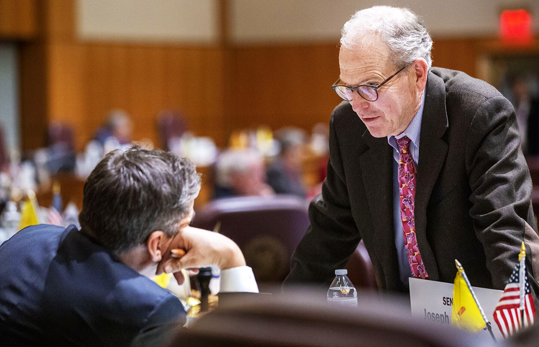 Sen. Joseph Cervantes, D-Las Cruces, left, and Senate Majority Leader Peter Wirth, D-Santa Fe, chat on the Senate floor Saturday. Luis Sánchez Saturno/The New Mexican
