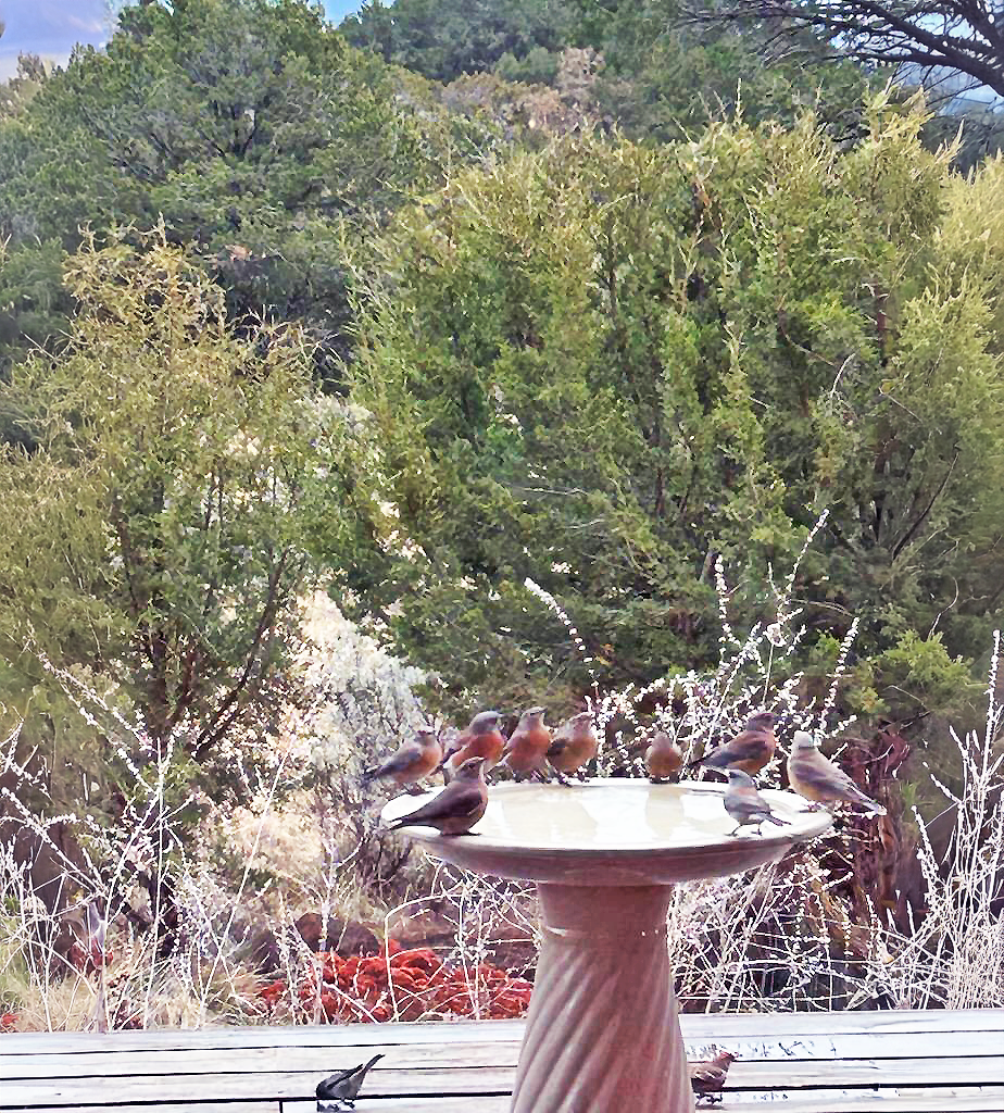 A small flock of Western Bluebirds and a lone Junco gather to sip water from a bird bath on the deck of a residence this morning in Pajarito Acres. Photo by Nancy Bartlit