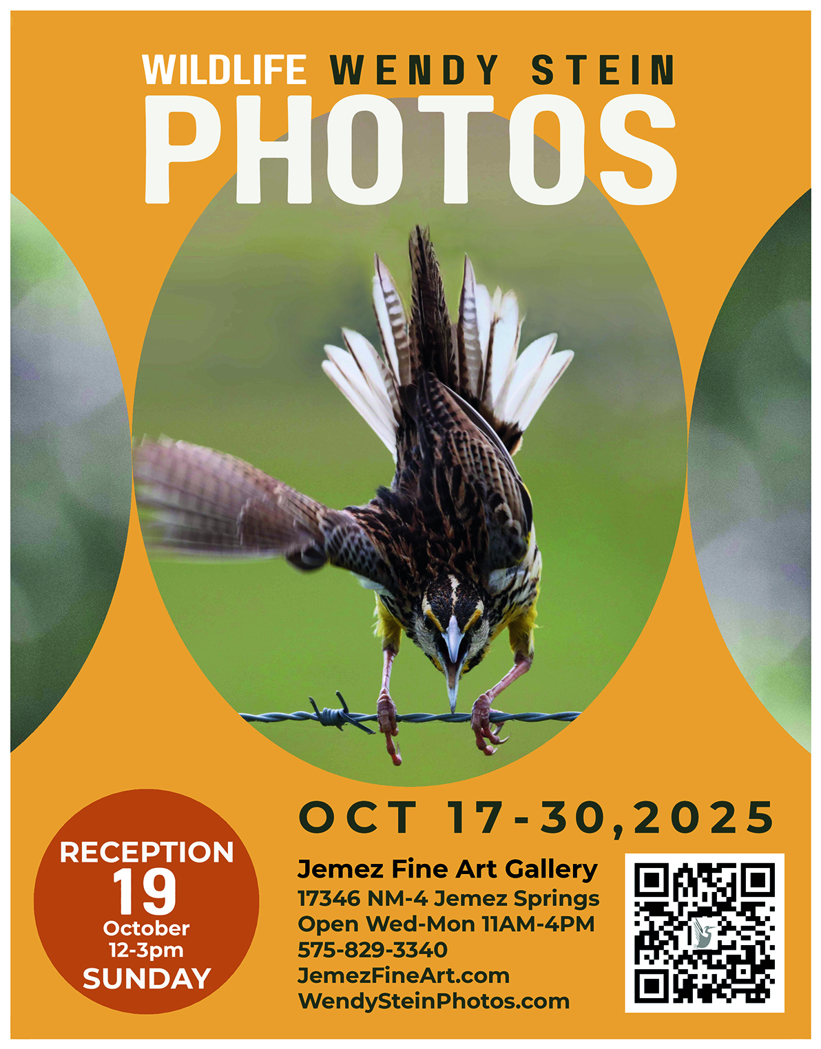 A wildlife photography show … mostly birds, primarily by Wendy Stein is on display until Oct. 30 at the Jemez Fine Art Gallery in Jemez Springs.